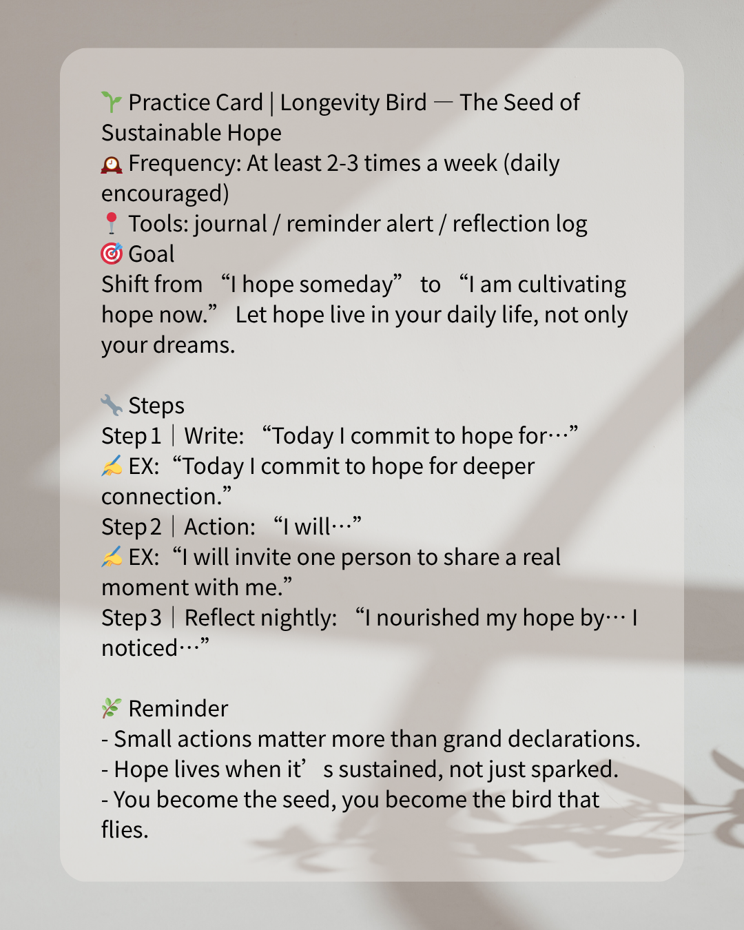 “I awaken the bird of longevity within me — I plant the seed of hope, tend it day by day, and let its wings carry me forward into enduring possibility.”