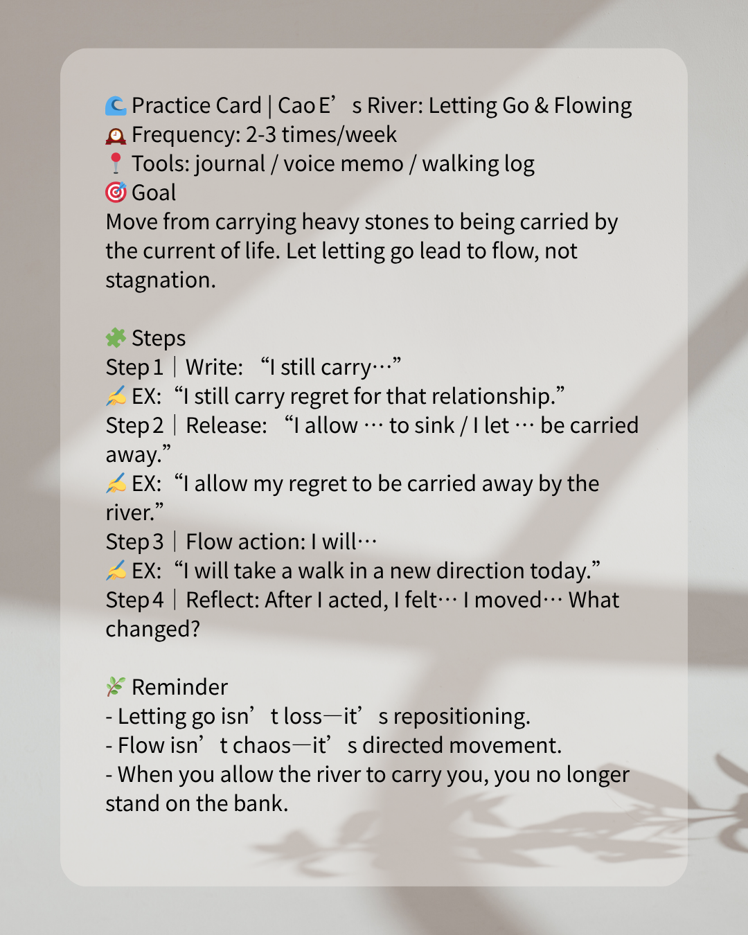 According to legend, Cao E jumped into the river to search for her father and became immortalised in the river’s name. Using “Cao E’s River” as metaphor reminds us: sometimes letting go isn’t giving up, it’s allowing what is to move into what could be. Letting flow means you’re not stuck on the bank—you’re in the current.