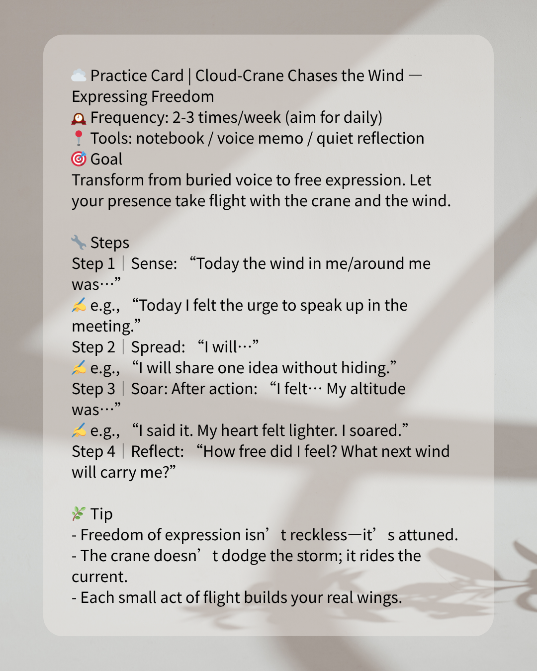 When you feel muted, constrained, silent—even though inside you a crane wants to rise—“cloud‑crane chasing the wind” reminds you: the wind is your ally, the cloud is your stage.