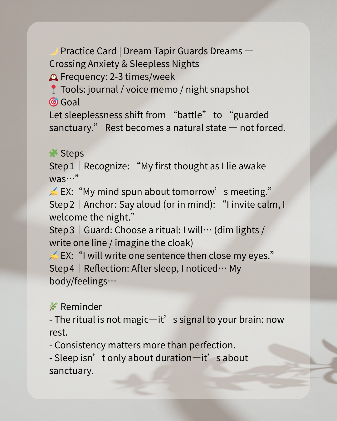 - Guard: Choose a small action before sleep: dim lights, write one sentence, imagine the Tapir’s cloak around you. This becomes the shift from busy mind to protected rest.