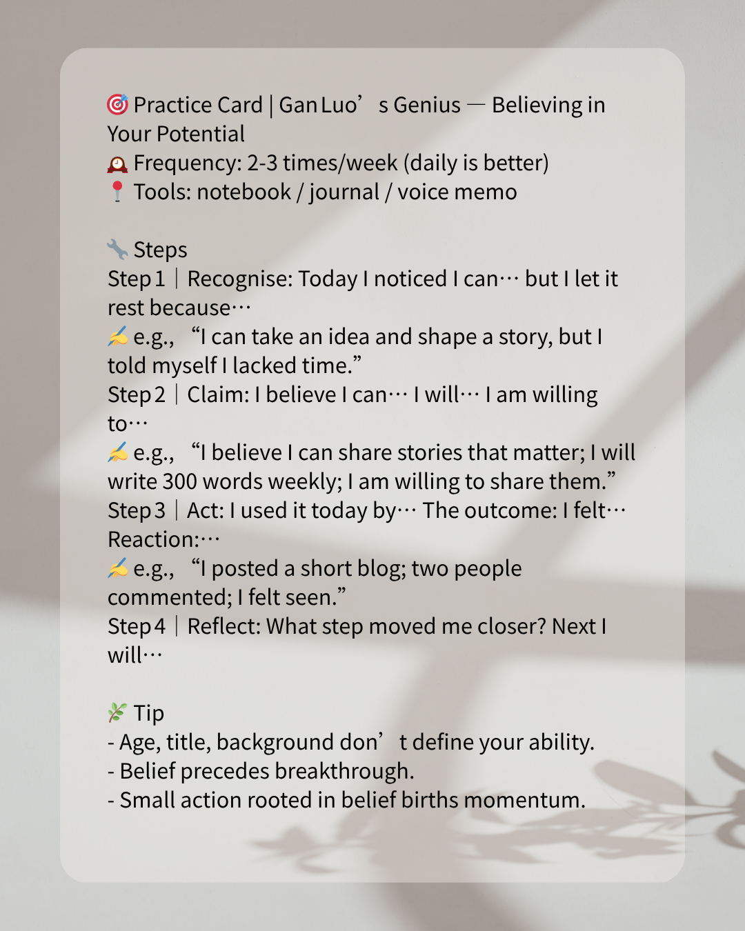 In ancient history, Gan Luo—a child prodigy—was recognised early for his wisdom and intelligence. His story reminds us that potential often remains hidden until we choose to believe it. This article will guide you to: (1) understand why your potential may stay dormant; (2) examine how to begin believing in yourself; and (3) follow a three‑step method plus a four‑week plan to awaken your talent, deploy it, and live it. A complete practice template is included to support you from “could be” to “is being”.
