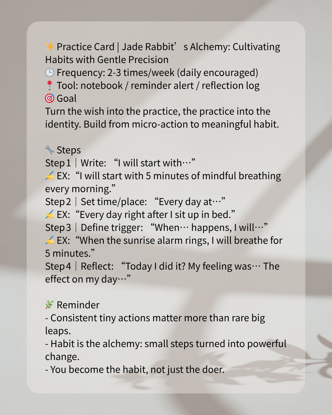 “I, like the Jade Rabbit beneath the moonlight, patiently refine my small actions into powerful habit‑elixir. Day by day I craft strength from subtle consistency.”