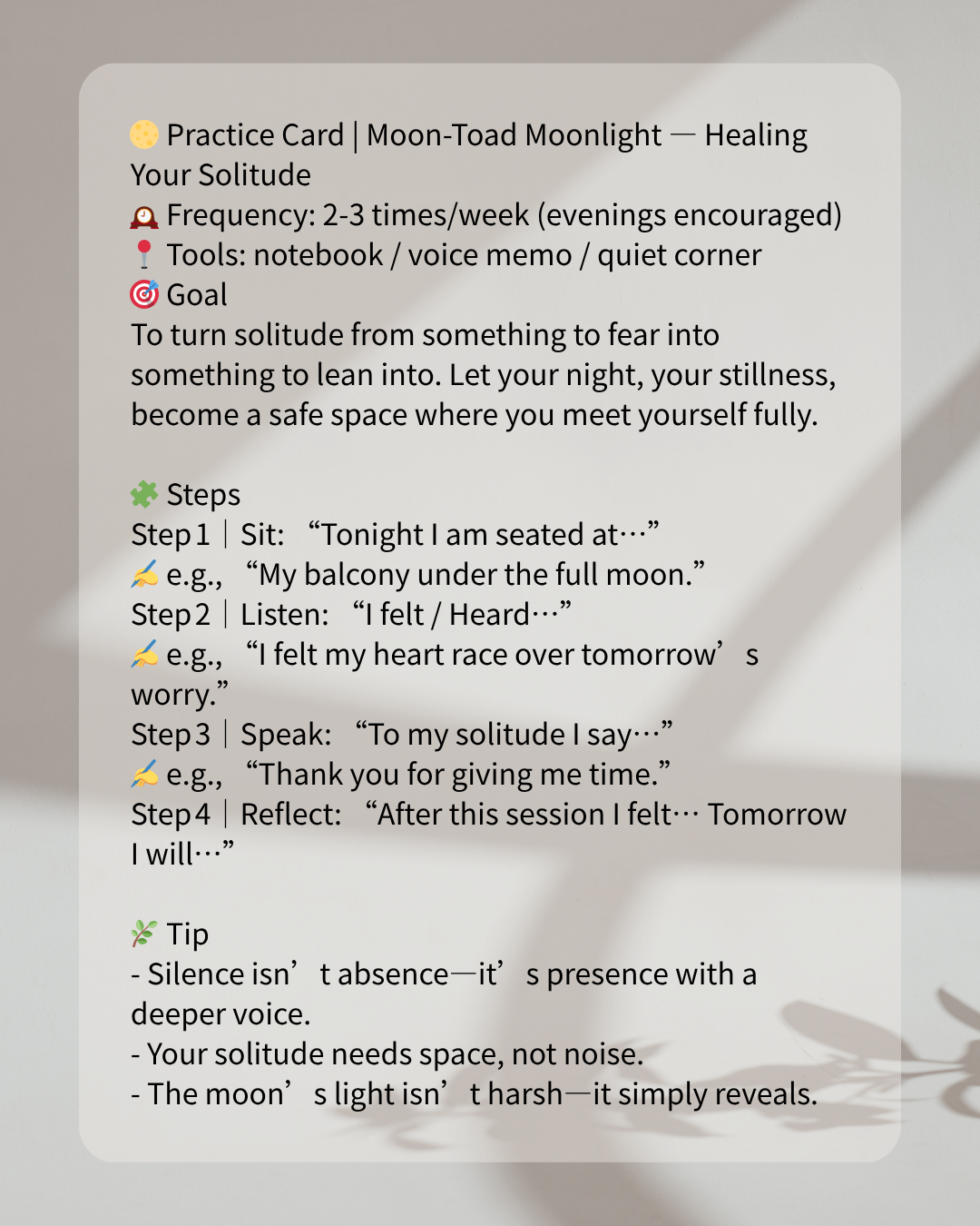 Solitude isn’t your shadow—it’s your space. If you’re open to further soft reflections, moon‑lit metaphors, and quiet companioning on your inner journey: 👉 Tap here to explore more about solitude, healing & moon‑toad companionship. When you invite the moon into your evening, and the moon‑toad sits with you—you don’t just survive the night—you enter it, you meet yourself.