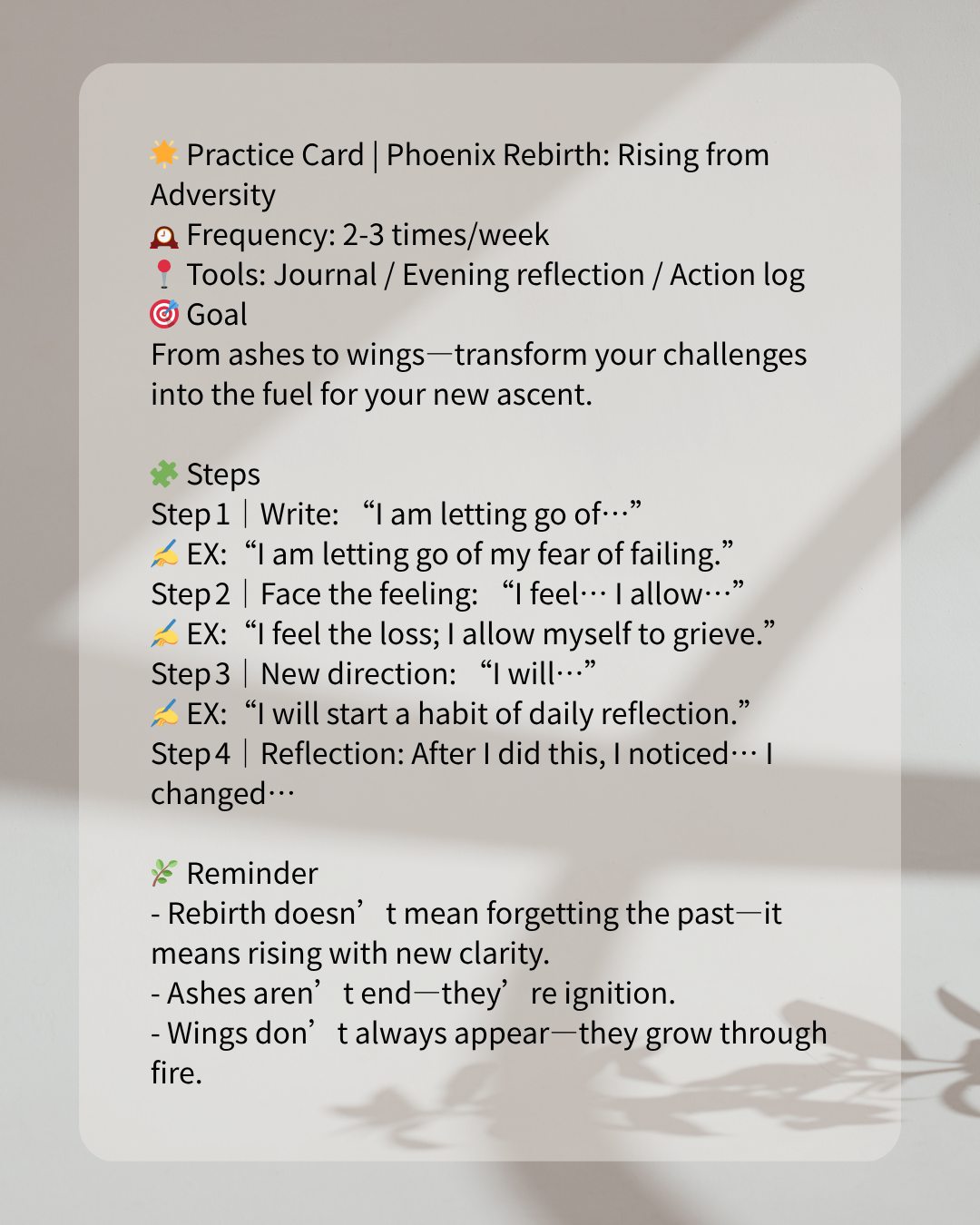 I remember the darkest days—feeling like my wings had been burned, left only with ashes and silence. I didn’t know how to fly again. Then I encountered the legend of the phoenix: burning, dissolving, and then rising, renewed. In that moment I realised: I am the ashes, but I am also the flame; I fell, but I can rise. Today, we begin with “Phoenix Rebirth”: let adversity become your springboard, let your wings take shape in the fire.