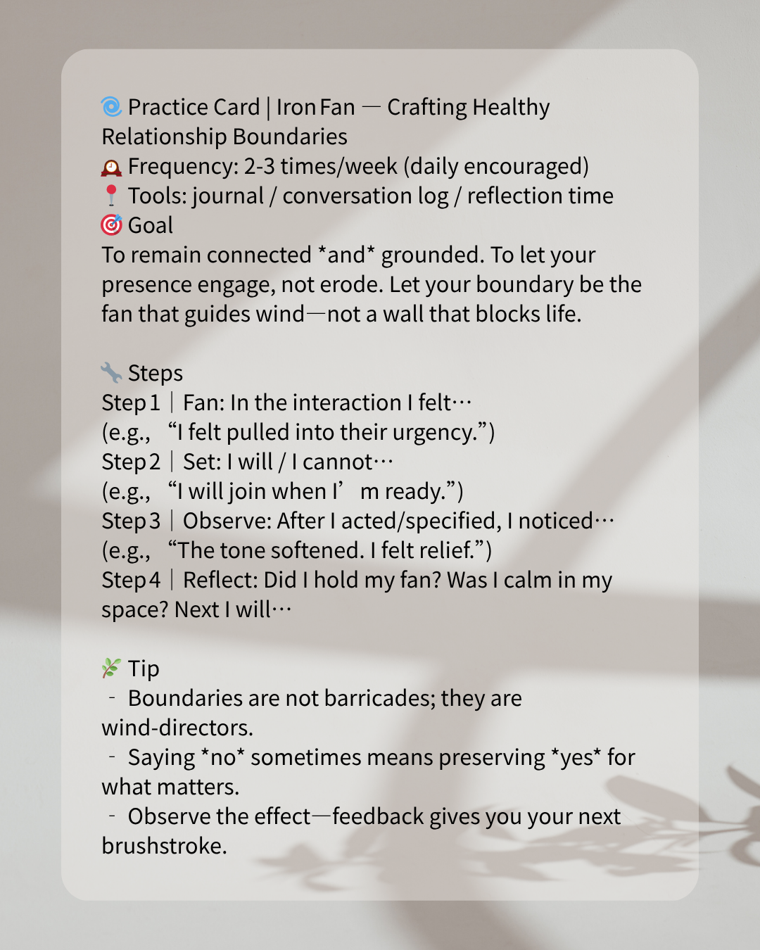 When your relational world feels too hot—too fuzzy or too over‑connected—the Iron Fan reminds you: you can direct the breeze instead of being blown away.