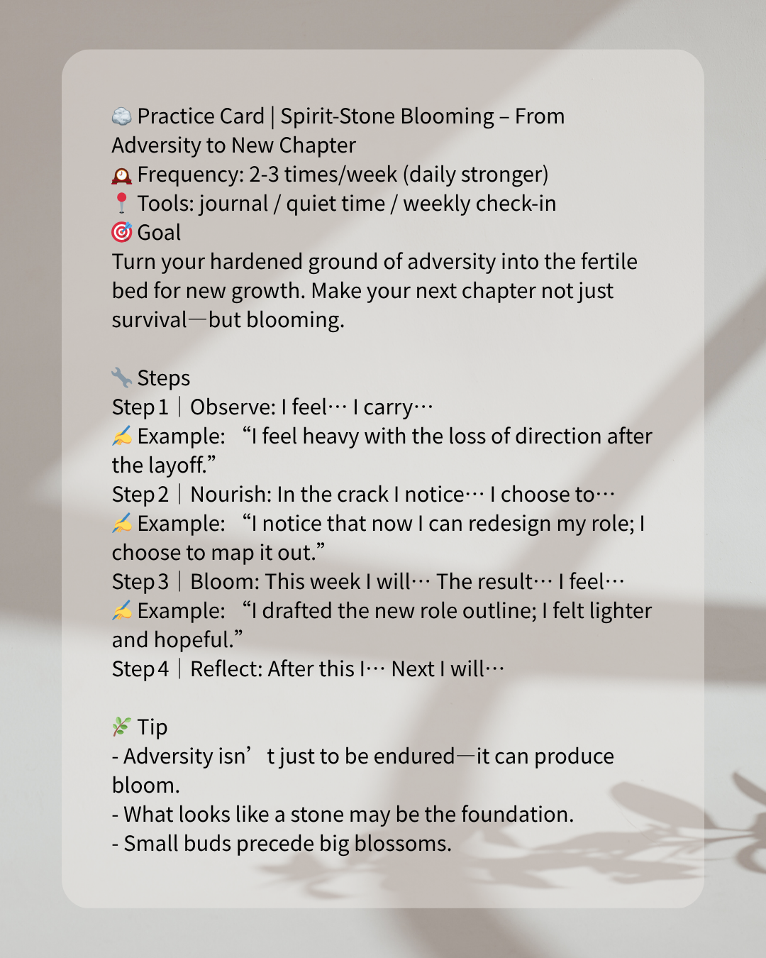- Observe the Stone – Reflect on your circumstance: what’s the heavy ground I’ve been carrying? Where is the pressure? Example: “After the project failed, I felt obsolete and stuck—like a stone.”