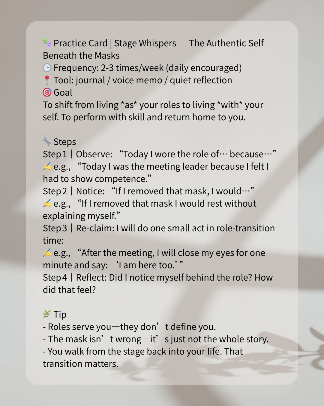 - Re‑claim your self: Before you enter the next role, do one small act: for yourself. A quiet breath. A silent acknowledgment: “Here I am.”