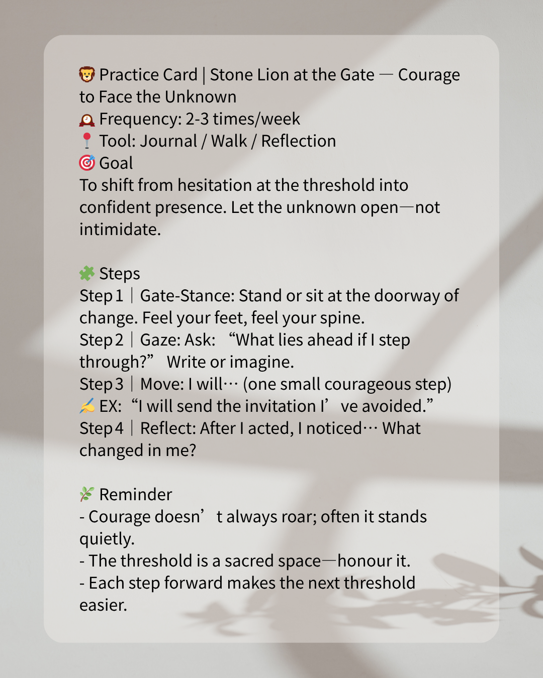 - Move in small courage: Choose one small action that crosses your threshold—introduce yourself, send the message, initiate the change. Let your lion‑roar be calm, not loud.