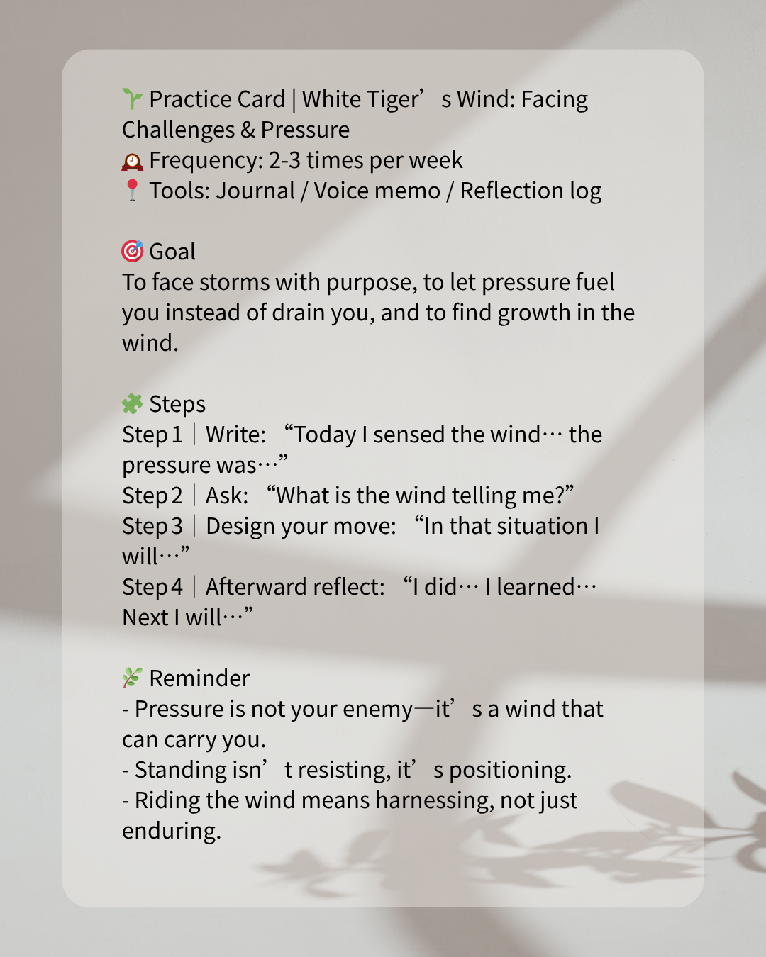 “I call forth the wind of the White Tiger—standing firm amid challenge and pressure, growing, advancing, and surpassing.”