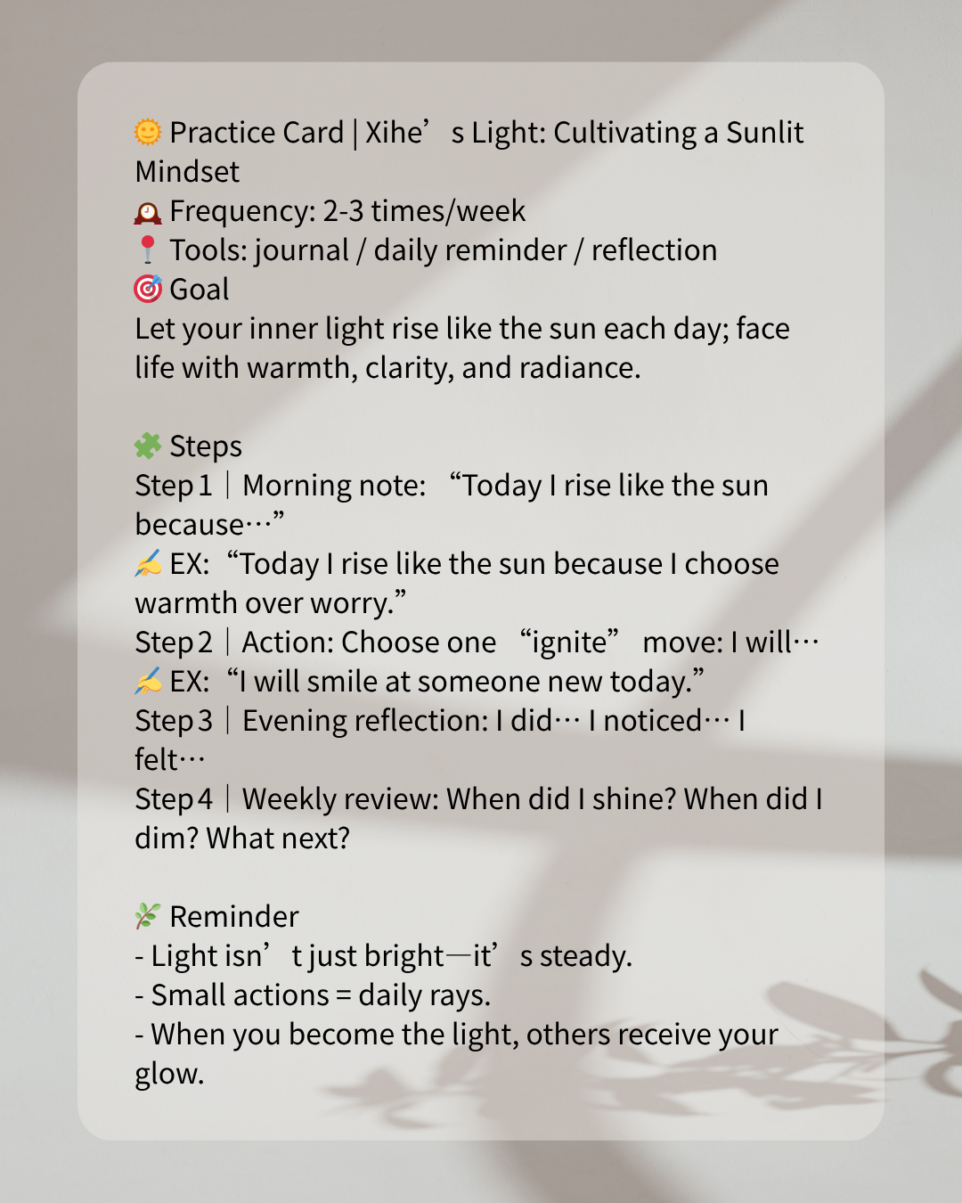 In Chinese myth, Xihe is the solar goddess who guides the ten suns in their chariot across the sky. When we adopt “Xihe’s Light” as a metaphor for a positive mindset, we commit to: every day is new; light isn’t a one‑time flash but a consistent internal presence.