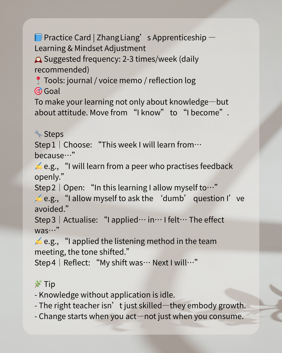 Learning isn’t only adding—it’s transforming. If you’re willing to be accompanied further by deeper reflections, stories and practices that shift your mindset and unfold your growth: 👉 Tap here to explore more about mindset learning, growth transitions & the Zhang Liang way When you apprenticeship the right way—you don’t just know more—you become more.